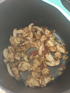- Na pršut dodajte i šampinjone te sve zajedno ispržite još koju minutu.